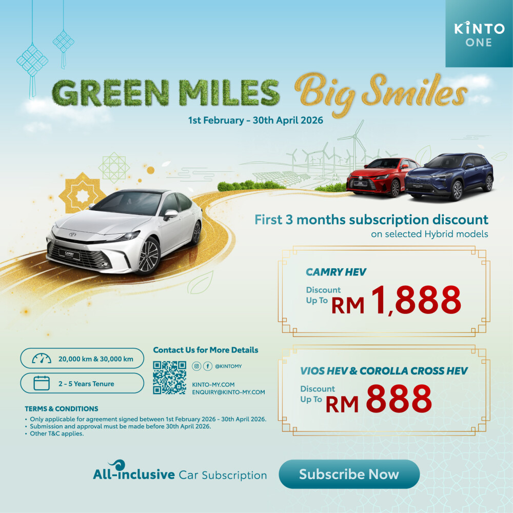Campaign Period: 1st February 2026 - 30th April 2026 Subscribe to KINTO ONE and enjoy up to RM1,888 off your first three months of subscription!